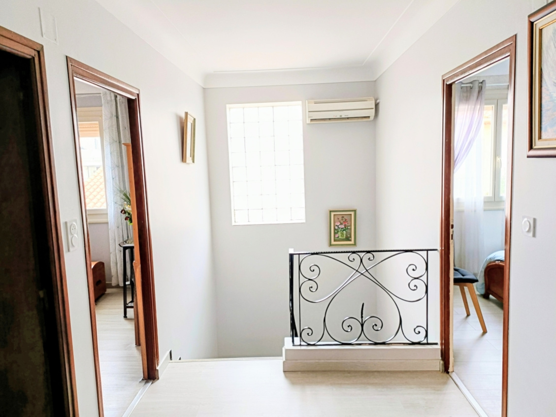 A l'étage, 4 chambres , une salle de bain, une salle de douche avec wc. Un balcon filant prolonge les espaces de vie avec une vue sur les Albères.